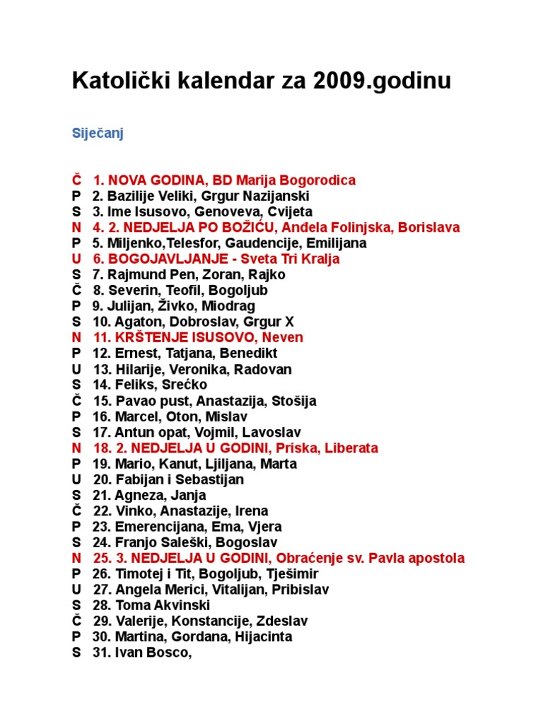 Katolicki Kalendar Za 2009 Godinu