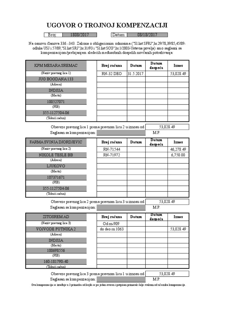 нашу вашу на основу члана 337. закона о облигационим односима дајемо изјаву да смо сагласни за компензацију пребијање. številka trr ki ga zastopa. Ugovorne strane su saglasne da se danom potpisa ove kompenzacije konačno izmiruju međusobna dugovanja u iznosima koji su gore navedeni s tim što će se ova kompenzacija finansijski sprovesti na način i u rokovima u svemu prema važećim zakonskim i drugim propisima.