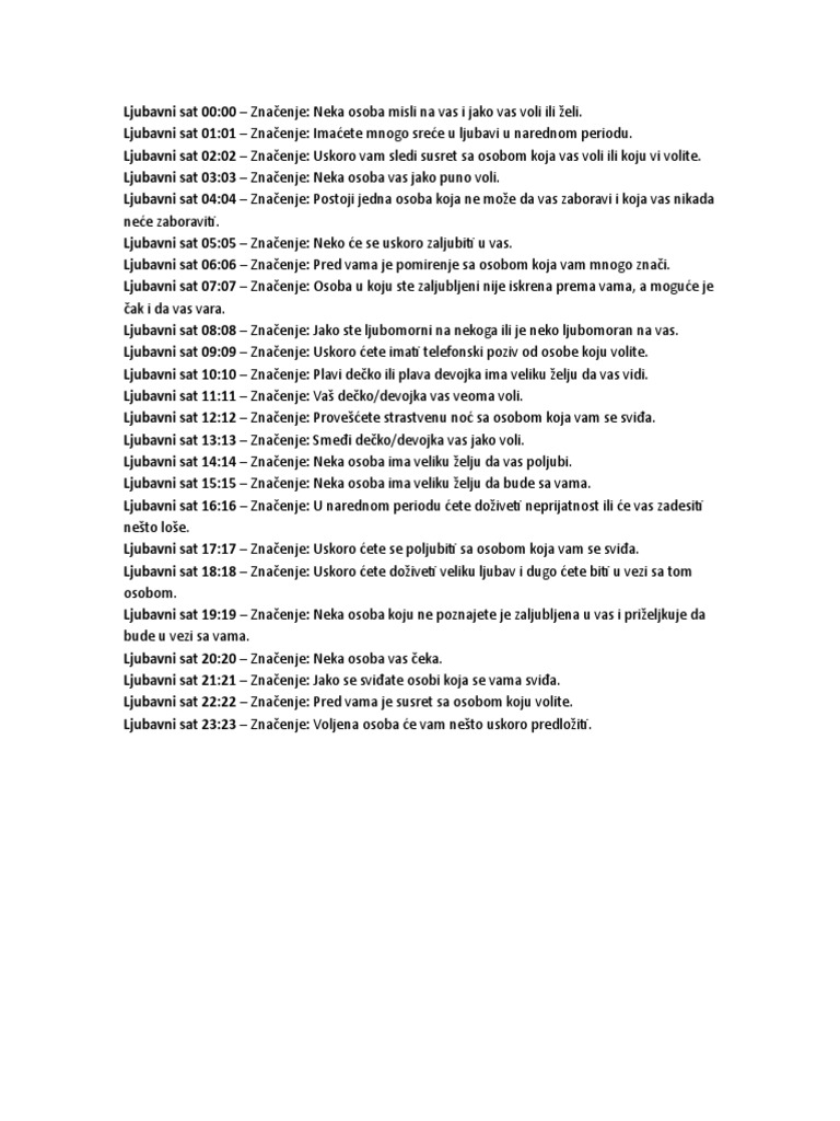 Ljubavni sat 01 01 vi imate dosta sreće u ljubavi a tako će ostati i u narednom periodu. 01 01 02 02 i dr ili poklapanje ciza na satu npr. Da bi značenje bilo autentično i istinito bitno je da slučajno pogledate u to vreme na sat a ne da ga isčekujete i namerno gledate u sat. Kao takvi trebalo bi da budete otvoreni za bilo koji znak koji možete primiti u periodu koji sledi.