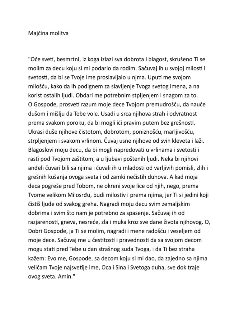 Nema silnijeg molitvenog obraćanja nego kada majka moli gospoda boga za spasenje svoga čeda. Hrišćani veruju da majčina molitva izbavlja od svakog zla čuva od loših dejstava i upućuje svog potomka na jedini istiniti i pr. Slava ocu i sinu i svetom duhu sada uvjek i na vijek vijekova. Oče sveti besmrtni iz koga izlazi sva dobrota i blagost skrušeno ti se molim za decu koju si mi podario da rodim.