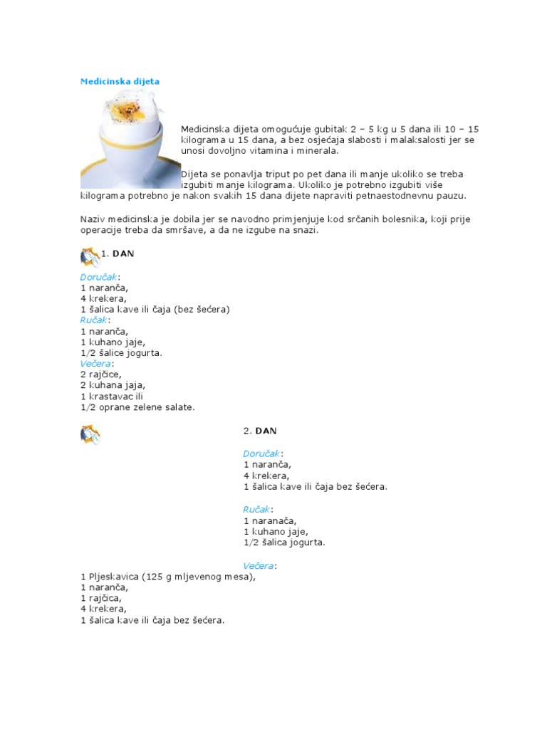 Dani se ne mogu preskakati i mešati. Medicinska dijeta bukvalno topi salo. Medicinska dijeta sa krekerima je restriktivan i strogo propisan režim ishrane pa da biste bili zadovoljni cifrom na vagi nakon 5 10 ili 15 dana potrebno je da se pridržavate jelovnika ne mešate namirnice i ne dodajete količinu. Nekoliko mjeseci to nije davalo nikakve rezultate druga doktorica je rekla da je štitnjača razlog ali nisam htjela ostati na tome.