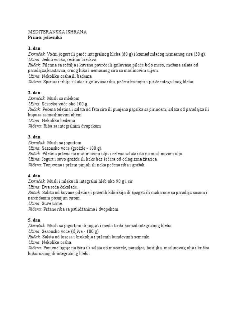 Mediteranska Ishrana Jelovnik